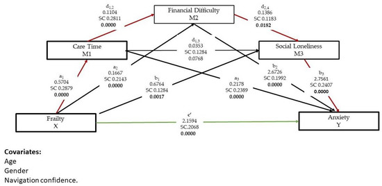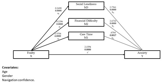 The serial mediation model assumes that there is a causal path from M1 care time to M2 financial difficulty to M3 social loneliness, and estimates this effect, whereas the parallel model assumes the effect is zero. After controlling for age, gender, and navigation confidence, we used PROCESS Model 6 to determine the significance of the direct, indirect and total effects of the serial mediation model. See Table 4. The total effect consists of a direct effect c’, from X frailty to Y anxiety and seven specific indirect effects (Figure 3). The direct effect c’ of frailty (X) on the anxiety (Y) is 2.16. The effect is significant (p = 0.0005). In other words, when controlling for other variables in the model, anxiety will increase by 2.16 points for a 1-point difference on the frailty scale.