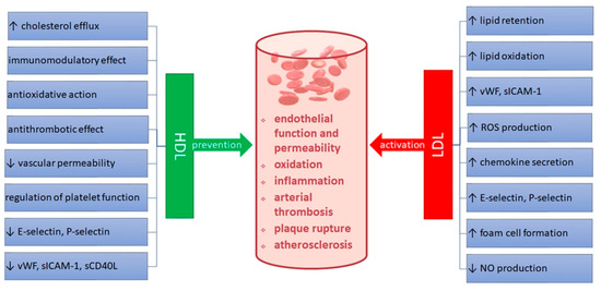 Numerous dysfunctions of HDL have been described in patients with cardiovascular diseases, including reduced capacity of cholesterol efflux from macrophages and other cells, a diminished inhibition of the expression of adhesion molecules on endothelial cells, an impaired stimulation of the bioavailability of endothelial nitric oxide, a limited activity in promoting the survival of endothelial cells, as well as impaired antioxidative effects [19]. Endothelial function and repair are potentiated by HDL [20].