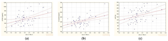 Correlations in the group of patients with coronary artery disease (CAD) between the atherogenic indicator, LDL-C/HDL-C, and (a) soluble ligand CD40 (sCD40L); (b) soluble E-selectin (sE-selectin); and (c) von Willebrand factor (vWF). The regression line is marked with a solid line, while the confidence intervals of 0.95 are marked with a dashed line.