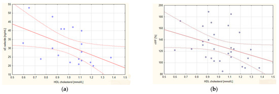 Correlations in the group of patients with stable angina (SA) between the high-density lipoprotein cholesterol (HDL-C) fraction and (a) soluble E-selectin (sE-selectin) and (b) von Willebrand factor (vWF). The regression line is marked with a solid line, while the confidence intervals of 0.95 are marked with a dashed line.