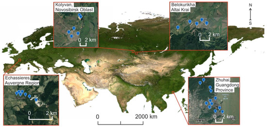 The sampling of environmental materials and in situ measurements of radiological parameters was conducted in the period from 2011 to 2018 at Belokurikha town in Altai region, and at Kolyvan town in Novosibirsk region, both in Russia; in the Zhuhai city, Guangdong province, People’s Republic of China; and in the city of Echassières, Auvergne region, France (Figure 1).