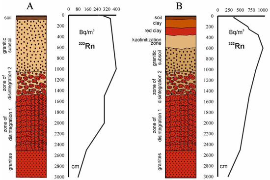 The transfer of U and Th from crystalline granite (where radon exhalation was reduced) to clay and soil layers did enhance the exhalation of radon isotopes into the soil pore spaces and increased the radon flux into the atmosphere. Therefore, exposure to radon isotopes was expected to be higher in regions with soils formed from weathered granites in comparison with exhalation from crystalline rocks. More detailed reports of the chemical and mineralogical composition and distribution of NRE in profile horizons are given elsewhere [1,71].