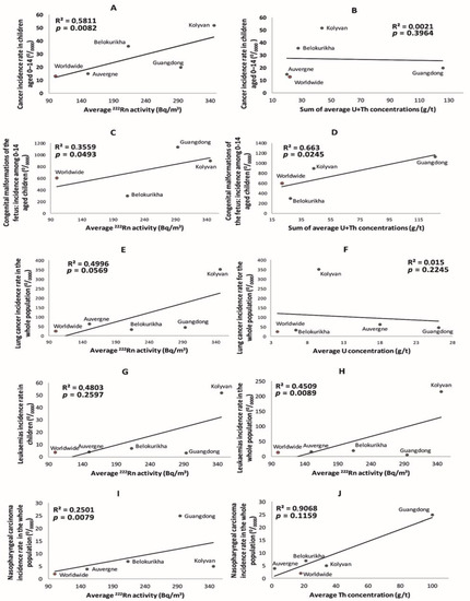 Dependence of all types of cancer incidence rate for children (0/0000) on 222Rn activity (Bq m−3) (A), and on the sum of U and Th concentrations in granites (g/t) (B). Dependence of CMF incidence rate for children (0/0000) on 222Rn activity (Bq m−3) (C), and on the sum of U and Th concentrations in granites (g/t) (D). Dependence of lung cancer incidence rate for the whole population (0/0000) on 222Rn activity (Bq m−3) (E), and on U concentration in granites (g/t) (F). Dependence of leukemia incidence rate for children (0/0000) (G) and for the whole population (0/0000) (H) on the 222Rn activity (Bq m−3). Dependence of nasopharyngeal carcinoma incidence rate for the whole population (0/0000) on the 222Rn activity (Bq m−3) (I), and on the average concentration of Th in granites (g/t) (J). Reference level of 222Rn activity according to WHO [33]; worldwide averages of U and Th concentrations according to Grigoriev [69]; worldwide averages of cancer incidence rate for children according to malignant neoplasms [54]; CMF incidence according to Hoffman et al. [55]; worldwide averages of lung cancer incidence rate according to Jemal et al. [49]; leukemia incidence rate for children according to Aksel et al. [62], and for whole population according to Jemal et al. [49]; worldwide average of nasopharyngeal carcinoma incidence rate according to Tang et al. [57].