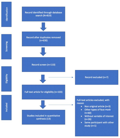 The flow diagram in Figure 1 shows a summary of the method that was used. Our initial search of all of the databases retrieved 819 studies. After duplicates were removed, 630 articles remained, and 110 articles were screened based on the title and/or the abstract to determine eligibility. After screening, seven articles were excluded because there was no full-text paper. One hundred and one full-text articles were eligible. Ninety articles were excluded for the following reasons: (1) studies with no variables of interest; (2) other types of facemasks; (3) the same participants were used with other papers. Therefore, thirteen studies were included in the quantitative synthesis.