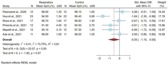 Six studies described the oxygen saturation of high workload activity and included five randomized cross-over studies and one non-randomized study, with a total of 87 subjects. The respirator models in the studies were N95, FFP2, and KN95. Different types of physical workloads included high-intensity bench press, exercise on a treadmill or cycle ergometer, and incremental continued running tests. Five studies used transcutaneous oxygen saturation or a pulse oximeter (SpO2) to detect the oxygen saturation during the experiment. Only the study by Fikenzer et al., 2020 [13], reported oxygen pressure (PAO2) from blood gas analysis, which was converted to SpO2 by the equation of Brown et al. [21] before the meta-analysis. No studies showed evidence of fit testing (Table 1). All results of the mean difference of SpO2 between the respirators and the control group after the workload are shown in Figure 2. The pooled mean difference estimates found a statistically significant lower SpO2 in the respirator group for −0.55% [−1.15, 0.05].