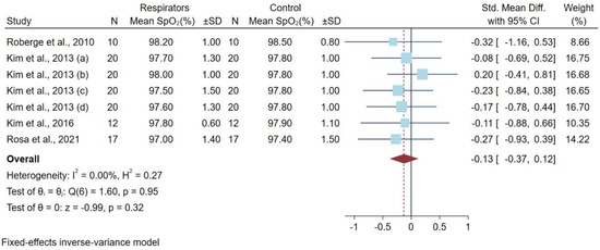 Seven studies reported the SpO2 of low-to-moderate workload activity, including three randomized cross-over studies, two non-randomized studies, one prospective cohort, and one cross-sectional study. The study by Kim et al. [15] had four subgroup experiments. One hundred seventy-four participants were included. The respirators used in the studies were FFP2 and N95 respirators. The physical activities included in the studies were moderate-intensity bench press, treadmill exercise (at speeds of 4.02–5.6 km per hour), and healthcare work (210–240 min) (Table 2). All results of the mean differences of SpO2 between the respirators and the control group after a low-moderate workload are shown in Figure 3. The pooled mean difference estimates found no statistically significant lower SpO2 in the respirator group for −0.13% [−0.37, 0.12].