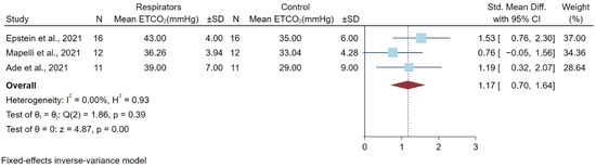 Differences in Carbon Dioxide Levels after a High Physical Workload. Abbreviations: CI, confidence interval; ETCO2, end-tidal carbon dioxide level; SD, standard deviation; Std. mean diff., standard mean difference [4,12,20].