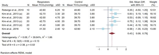 Four studies reported PCO2 after a low-to-moderate physical workload with 54 participants. The study by Kim et al. [15] had four subgroup experiments. All studies used transcutaneous CO2 (TcCO2) to measure PCO2. The study designs included two cross-over randomized controlled trial designs and two non-randomized controlled trial designs. All studies used N95-type respirators, but in different models. All studies’ physical workload was treadmill exercise, using a speed of 5.6 km per hour for one hour. Only a study by Powell et al. [17] had no fit testing (Table 4). A meta-analysis from the pooled different means of PCO2 after a high physical workload showed statistically significant higher PCO2 levels in the respirator group for 0.43 mm Hg (0.08, 0.79) (Figure 5).