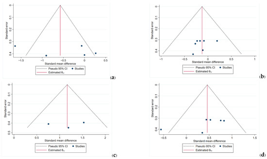 Funnel plots; (a) the differences in oxygen saturation after a high physical workload; (b) the differences in oxygen saturation after a low-to-moderate physical workload; (c) the differences in partial pressure carbon dioxide after a high physical workload; (d) the differences in partial pressure carbon dioxide after a low-to-moderate workload.
