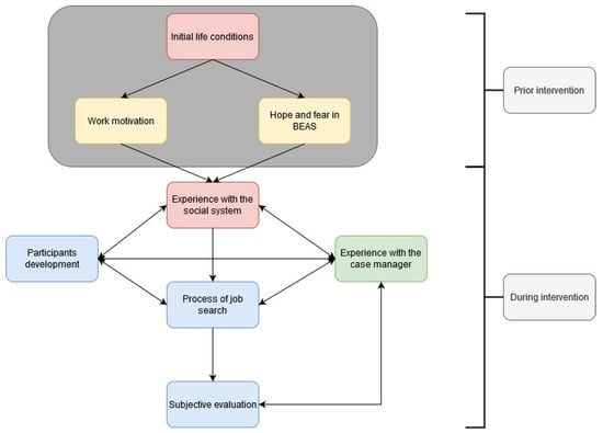 In this paper, we seek to display the experience of participants taking part in the BEAS intervention, as well as perceived barriers and facilitators. We further aim to describe the possible relations of barriers, facilitators and experiences related to BEAS: Firstly, categories were divided into “prior intervention” and “during intervention”. Categories describing the “prior intervention” phase contain, for example expectations and initial conditions, such as motivation for work of the participants themselves. The starting point category system is the initial life condition of the participants, describing current problems and their impact on work motivation and hopes and fears. Categories describing the “during intervention” phase describe the experiences of participants with the intervention, other stakeholders within the social security system and their emotional development. We hypothesize the complex relations of these categories, showing bidirectional influences. The relationships are hypothesized on both existing literature and the data, which we will explain later in this paper. Figure 1 shows how we hypothesize the categories relate to each other.