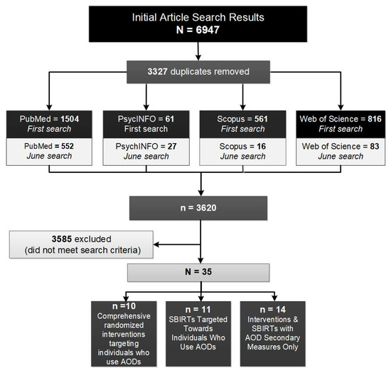 - SBIRTs with AOD use as secondary measures; that is, AOD use was not an eligibility requirement for participants.