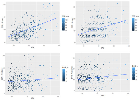 To further explore and to visually inspect the correlational results, four plots displaying the distribution and the linear associations between ECR-Anxiety and both ASA-27 and SASI (Figure 1, top plots), as well as the associations between ECR-Avoidance, ASA-27, and SASI (Figure 1, bottom plots) have been produced.