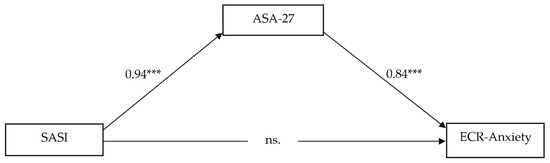 In line with the obtained correlational results, only one mediational model was performed in order to investigate the direct and indirect effects of SASI on ECR-Anxiety and mediated by ASA-27, as displayed in Figure 2. Since neither SASI nor ASA-27 has been shown to significantly contribute to ECR-Avoidance, no mediational model with these variables was performed. Moreover, as reported in the Data Analysis section, only effect size medium (>0.30) results were considered in the present study.