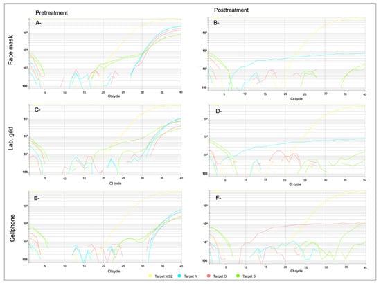 Heat-inactivated SARS-CoV-2 gene evaluation by RT-qPCR for (A,B) face mask, (C,D) lab grid, and (E,F) cellphone treated with 90 ppm of ozone for 120 min (65–70% humidity). Target MS2: MS2 Phage as a control for the RNA extraction; Target O, N, and S: specific SARS-CoV-2 target sequences in the ORF1ab, nucleocapsid, and spike protein gene respectively. (A,C,E) images correspond to materials before exposure to ozone that showed Ct values <37, indicating positive amplification of the three viral genes. (B,D,F) images correspond to materials treated with ozone that showed no amplification of the viral targets O, N, or S, where only the control target MS2 was amplified.