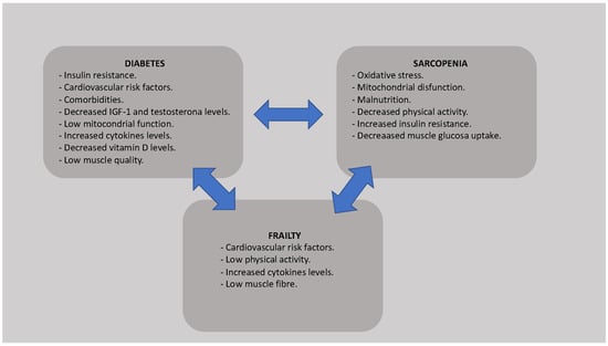 Diabetes mellitus is characterized by a state of chronic hyperglycemia associated with alterations in carbohydrate, fat, and protein metabolism leading to a deficit of insulin secretion and to insulin resistance, which are involved in muscle protein loss. Elevated levels of cytokines, such as TNFα, IL-1, IL-5 or IL-6, common in patients with T2DM, can induce insulin resistance. In addition, the usual mitochondrial dysfunction in diabetic patients favors altered lipid oxidation, elevated lipid in muscle cells, and insulin resistance, which increases the development of frailty and sarcopenia [9]. Moreover, loss of muscle mass secondary to sarcopenia and age also leads to metabolic dysregulation resulting in reduced insulin sensitivity, altered oxidative defenses, and decreased mitochondrial function. Age-related alterations in the hypothalamus–pituitary–testicular, hypothalamus–pituitary–adrenal, and insulin-like growth factor I (IGF-1) and type 1 IGF receptor (IGFR1r) axes increase the loss of muscle strength [10]. Testosterone and IGF-1, hormones involved in muscle protein synthesis, are decreased in patients with T2DM. In addition, frequent alterations in the adipocyte hormone leptin and ghrelin in older age also interfere negatively with plasma insulin levels [11]. All these pathophysiological changes explain how diabetes mellitus, advanced age, frailty, and sarcopenia are interrelated (Figure 1).