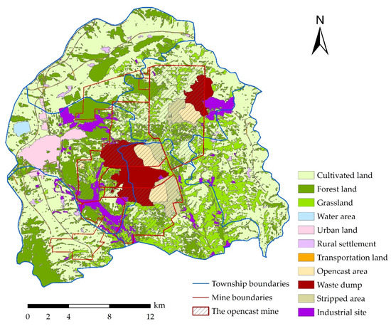 The remote sensing image was downloaded from the official website of the United States Geological Survey (USGS) (https://earthexplorer.usgs.gov/ accessed on 18 December 2021). In this study, the Landsat TM remote sensing image in 2019 was selected with a resolution of 30 m. After systematic radiometric correction and geometric correction, software such as ENVI 5.2 (Exelis Visual Information Solutions, New York, NY, America) and ArcGIS 10.2 (Environmental Systems Research Institute, Redlands, CA, America) were used to select the required bands for fusion, mosaic, and cropping. In view of the characteristics of highly complex land-use types, fragmented landscapes, and complex terrain in the mine–agriculture–urban study area, the 5-4-3 standard false color band was used to supervise and classify the land-use types in the study area. The classification standard was mainly based on the Classification Standard of Land Use Status (GB/T 21010-2017) and combined with the actual land-use status of the study area. The land-use types were divided into 11 categories, including cultivated land, forest land, grassland, urban land, rural settlement, transportation land, opencast area, waste dump, stripping area, industrial site, and water area. We manually corrected the misclassification and omission in the interpretation results, referring to Google Earth to maximize the classification accuracy. The classification results are shown in Figure 3. The land-use data were used to analyze the characteristics of land use and ecological environment in the study area, and to serve as one of the bases for determining future development and management goals in the study area.
