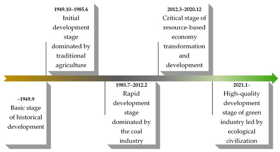 The development process of Pinglu. (The line with arrow represents the time sequence of Pinglu’s development; the yellow line represents the historical development foundation stage and the initial development stage relying on the traditional characteristic industries in the loess area; the black line represents the rapid development stage and part of the transformation critical stage mainly relying on coal; and the green line represents part of the transformation critical stage and the high-quality development stage seeking the transformation of resource-based towns and the green development road. The data were compiled from the policy documents published by the People’s Government of Shanxi Province (http://www.shanxi.gov.cn/ accessed on 18 December 2021), and the figure was made by Shufei Wang).