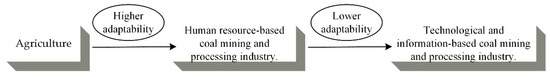 During the development of the study area, the residents are constantly adapting to the changes in the area (Figure 5). Before the coal mine construction, residents mainly engaged in agricultural production. In the process of coal mine construction, under the leadership of managers and technicians, residents participated in coal mine construction activities, and their income increased. At the same time, this area attracted many foreigners. During this process, although the agricultural production mode was quickly transformed into industrial production, residents showed a positive attitude and high adaptability driven by interests. In the process of coal mining, land needed to be acquired, and the residents who originally lived there needed to be relocated to other places. Four large-scale residents’ relocation activities were carried out in the study area in 1985, 1998, 2008 and 2011 [12]. During this process, residents moved from rural areas to towns, and from independent courtyards to buildings. Their living environment and way of life changed greatly, which takes a long time to adapt to. During this process, most residents showed a positive attitude, because their new living environment was cleaner and more convenient, and at the same time, they could obtain regular financial and material compensation from the coal mining enterprises. With the technology advancement, machines have replaced most of the labor force, so worker layoffs in the coal mining enterprises occurred. Moreover, most laid-off workers were engaged in low-skill jobs, which lead to problems in their re-employment and living security. Among them, some started to work by earning an unstable income in the local labor market, others found work in other cities. During this process, industrial production was quickly transformed to other production methods, but the loss of stable occupations and incomes creates negative attitudes and thus lower adaptability of the residents.
