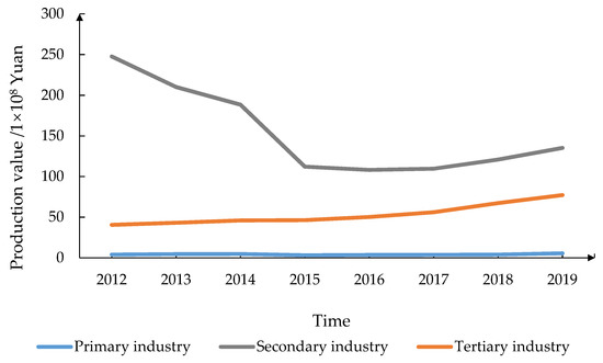 The changes in the industrial structure of Pinglu from 2012 to 2019. (The data were compiled from the Shanxi Statistical Yearbook from 2013 to 2020, and this figure shows the changing trend of the proportion of the output value of the three major industries in the total output value, which was made by Shufei Wang).
