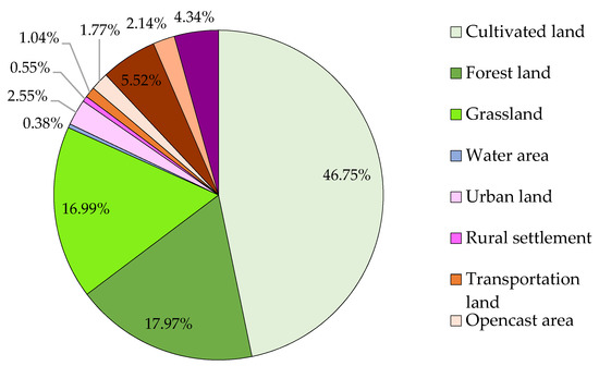 This mine–agriculture–urban compound area is located in the Loess Plateau hills with a fragile ecosystem background [12]. Figure 7 shows that, in this area, cultivated land is the largest component, accounting for 46.75%, but its proportion of the total industry is small (Figure 6). The area of forest and grassland accounts for 34.96%, which supports the development of regional animal husbandry to an extent (Figure 6 and Figure 7). The area of coal mining area accounts for 32.48% (Figure 3), where 13.77% is the mining and dumping area (Table 1). The residential area accounts for 3.10%, the water area accounts for 0.38% and is mainly located in Jingping Town, and transportation land area accounts for 1.04% (Figure 7).