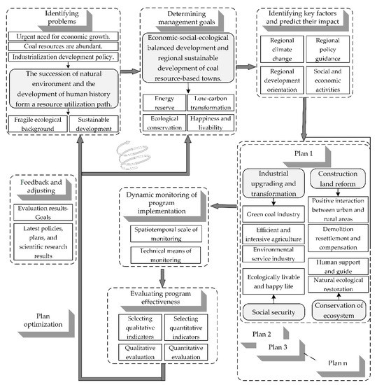 Figure 8 shows the logical framework of social–ecological system management in this compound area based on the above analysis and the determination of regional management objectives. The specific process includes: (1) Identifying problems in this area. Against the background of economic development needs, abundant resource reserves, and national industrialization development needs, the study area has formed a fragile ecological background and a weak development foundation, which is the key problem to be solved in the current regional sustainable development. (2) Determining management goals. In order to achieve sustainable development, the coordination and balance of economy, society, and ecology should be the future development goals in the social–ecological system of this compound area, including energy reserve, low-carbon transformation, ecological conservation, and happiness and livability. (3) Identifying key factors and predicting their impact, which are mainly carried out through climate change, policy guidance, regional development orientation, and social and economic activities dominated by mining and agriculture. According to different combinations of key factors, the corresponding future development scenarios can be simulated, and the key constraints in different scenarios can be identified. (4) Designing and implementing plans. Based on the constraints of each development scenario, corresponding management strategies can be designed, and a series of adaptive management plans can be formed. The adaptive management strategy should be proposed and implemented mainly through industrial upgrading and transformation, mining land reform, ecological maintenance and restoration, and grassroots employment and livelihood security. For example, ① by developing a green coal industry, efficient and intensive agriculture and environmental service industries, the upgrading and transformation of the industrial structure of the research area can be realized; ② By encouraging the positive interaction of urban and rural areas, and through scientific planning of the mining area demolition, resettlement and compensation policies to realize the goal of the construction land reform of the mining area; ③ By providing human support and guidance to assist the natural ecological restoration and achieve the goal of high-quality protection of the damaged ecological environment; ④ By building a social security system based on the goals of ecologically livable and happy life. (5) Dynamic monitoring of program implementation. The above plans should be monitored from multi-scale and multi-angle by using the remote sensing technique, low-altitude photographic surveying, and face-to-face interview surveys. (6) Evaluating program effectiveness. By reasonably selecting qualitative and quantitative indicators, and comparing the monitoring and analysis results with the set goals to evaluate the implementation process and results of each plan. (7) Optimizing the plan. Some good plans are selected based on the evaluation results. (8) Providing feedback and adjusting management processes based on the latest policies, plans, and scientific research results to update the problems identified originally, and to adjust the objectives and content of the preferred plans. In summary, through the continuous cycle of the adaptive management process, the optimal plan can finally be carried out to promote the sustainable and high-quality development of the social–ecological system in the mine–agriculture–urban compound area.