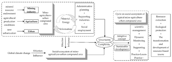 The mine–agriculture–urban compound area is a special type of area formed in the process of resource exploitation and regional development. In 2015, Cao firstly proposed and defined the “mine–agriculture–urban compound area” as a community of resources, economy, and society in which exist the material circulation and energy flow of the development process, where mineral resource exploitation, processing and service, agricultural production, and biological resources utilization are the primary industries [12]. The development of this region involves economy, society, and ecology. Under the dual goals of economic and social development and ecological and environmental protection, a complex social–ecological system is formed in this region. An analysis of the above connotations indicates that the social–ecological system of the mine–agriculture–urban compound area refers to a system in which the human economy and society and the natural ecological environment are closely linked, interdependent and coupled under the joint action of mineral resource mining and processing, agricultural production, and urban development [12]. Especially in China, on the one hand, coal resource-rich areas are mostly coupled with areas having a fragile ecological environment [13]; on the other hand, large-scale coal bases are mainly distributed in arid or semi-arid areas at this stage [14]. That is, the social–ecological system in China’s mine–agriculture–urban compound area is faced with a prominent contradiction between ecological environment protection and economic and social development, and the future development of this region will be subject to severe challenges. Furthermore, in view of the above-mentioned characteristics and problems of the social–ecological system in this compound area, adaptive management has become a guiding concept [11,15,16].