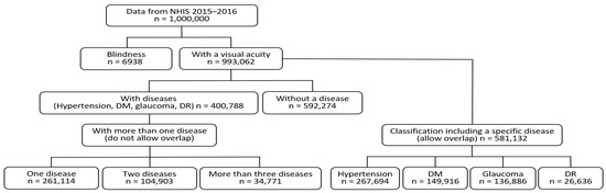 The NHIS in Korea operates the National Health Insurance Sharing Service (nhiss.nhis.or.kr) to provide medical services and develop related policies by reporting various data sources such as sample research, customized, and health disease index databases. The data (released for the first time on 24 November 2021) used in the present study were obtained from the National Health Insurance Sharing Service for one million adults aged ≥ 20 years during 2015–2016 [22]. The data mainly included visual acuity and a history of diagnostic tests for hypertension, DM, glaucoma, and DR. The flow chart of the study population according to diseases is shown in Figure 1. This study was exempted from full review by the Institutional Review Board of Kangwon National University (KWNUIRB-2021-07-010) because the data source comprised de-identified secondary data released to the public for research purposes.