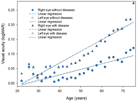Early studies on age-related changes in decimal visual acuity [39,40] showed that older adults without a specific visual pathology exhibited an age-related decrease in visual acuity, similar to individuals with documented visual pathologies. However, the above studies had limitations as they used decimal visual acuity instead of logMAR visual acuity, included populations of only tens or hundreds of individuals with glaucoma and cataract or age-related maculopathy, and did not clearly reveal the difference between visual acuity with and without diseases. Unlike these studies, ours was based on a large population, utilized logMAR visual acuity, and analyzed four diseases. Moreover, our findings based on linear regression analyses revealed that the visual acuity outcomes according to age tended to be worse with diseases than without diseases in terms of the coefficient of correlation. Other studies performing regression analysis of ocular refraction or age-related visual acuity [41,42] showed that visual acuity of healthy eyes and ocular refractive errors related to visual acuity had a point of inflection around the age of 30 years. However, bilinear models with a breakpoint based on 30–50 years of age and visual acuity were not included in our study. Although our findings revealed no trend in bilinear models until the age of 50 years, the above analyses revealed little reduction in visual acuity before 50 years of age.
