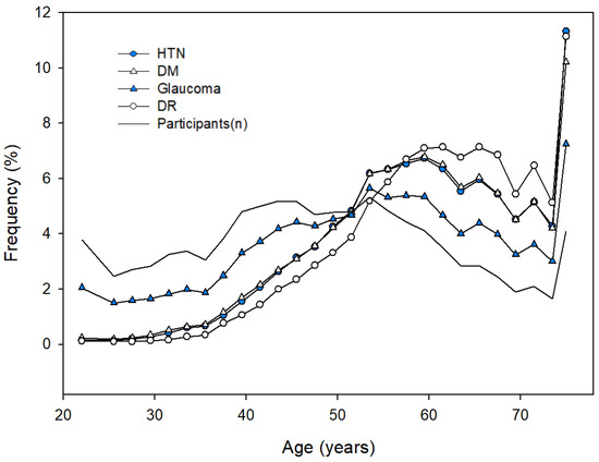 In this study, the prevalence of hypertension, DM, glaucoma, and DR increased slightly with age, and the number of diseases increased moderately. Various trends in the age-related prevalence of these diseases have been reported in the literature [43,44,45]. However, in our analysis of the frequency of diseases according to age, the frequency of each disease was not significantly correlated with the number of participants, except in the case of glaucoma. However, a very high positive correlation of 0.918 or more was observed between each disease. These results suggest that the frequency of a disease correlates more with the frequency of other diseases than with the percentage of participants. The association between diseases has been reported in several previous studies, including the association of hypertension with DR [14], presence and risk factors for glaucoma in patients with DM [33], the prevalence of DR in DM [27], and an association between DM and glaucoma [36].