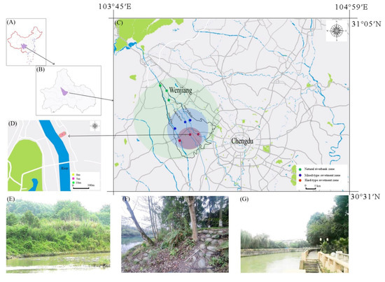 Distribution of the sampling plots along three main rivers in Wenjiang district. Sichuan Province is located in the southwest of China (A); Wenjiang is in the middle of Chengdu (B). Different urban–rural habitats are marked with round color blocks (C). Green color block represents a rural habitat, blue color block represents a suburban habitat, red color block represents an urban habitat (C). All sampling plots are marked with colored dots (C,D). Green dots represent a natural riverbank zone in a rural habitat, blue dots represent a mixed-type revetment zone in a suburban habitat, and red dots represent a hard-type revetment zone in an urban habitat (C). Yellow dots, purple dots, and black dots represent the sampling locations with different distances from the edge of the riverbank in each type of revetment zone (D). (E) Natural riverbank zone (NR); (F) mixed-type revetment zone (MR); (G) hard-type revetment zone (HR). Image (C) is exported from Planning Cloud (www.guihuayun.com, accessed on 27 October 2021).