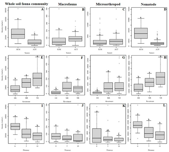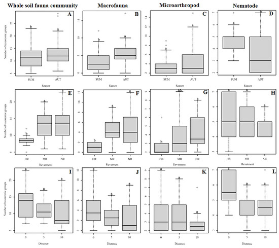 Richness of soil animal groups in two seasons (A–D) and richness of soil animal groups of three revetment types (E–H) and three distances (I–L) in summer. Taxonomic group number is the number of families, except insect larvae, which were at the order level. Each box plot displays the median (bold lines), the interquartile range (box), minimum and maximum values (whiskers), and outliers (circles). Different lower-case letters indicate significant differences among revetment types and distances (p < 0.05). The plots of three revetment types and distances in autumn are not presented due to non-significance.