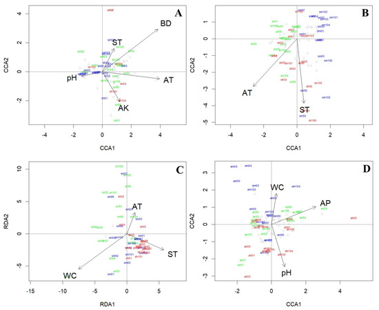 Canonical correspondence analysis (CCA) and redundancy analysis (RDA) ordination plots showing relationships between different soil fauna communities and environmental factors in two seasons. (A) soil macrofauna community in summer (CCA); (B) microarthropod community in summer (CCA); (C) hygrophilous mesofauna community in summer (RDA); (D) microarthropod community in autumn (CCA). Arrowhead indicates the direction of increase, and arrow length represents its relative influence. Different colors represent different revetment types (green = NR; blue = MR; red = HR). Grey circles represent different soil animal families. pH = soil pH; SBD = soil bulk density; AN = ammonium nitrogen N; AP = available P; AK = available K; WC = soil water content; AT = air temperature; ST = soil temperature.