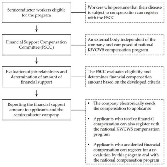 This study introduced the FSC programs operated by two semiconductor companies (Samsung and SK Hynix) that provide financial support to semiconductor workers who have suffered WRDs such as cancers, rare diseases, and reproductive health problems (hereafter referred to as a suspected WRD). These programs are independent of the national compensation program operated by the Korea Worker’s Compensation and Welfare Service under the IACIA. The key contents of the programs available on websites provided by the two companies for the registration are summarized and described [,].