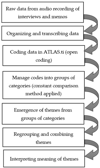 In the next analysis phase, categories and themes were identified using the network feature in ATLAS.ti. All open codes and categories were arranged and grouped together to form common themes. All themes were derived from the transcriptions and interviews only, and were not identified at advance. For each process, a memo was written after coding each transcript in order to capture the gist of each interview for the purpose of exploring the participants’ opinion, as opposed to line-by-line coding. This memo also acted as a reflexive note for the thoughts of researcher to minimize potential bias when analyzing the transcripts. Quotes for each theme were translated, organized, and summarized. A summary of the thematic analysis steps is provided in Figure 1.