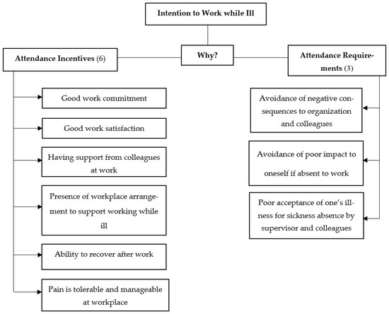 In enhancing the intention to work while ill, participants themselves play a major role. By having a strong work commitment and good degree of work satisfaction, participants felt more motivated and pushed to go to work despite being ill. Participants’ feelings of responsibility and happiness towards their work would not feel like a burden to them. A meta-analysis by [30] emphasized on the “want to” rather than the “have to” aspect of behavior is implicated by the impact of job attitude and organizational justice. Being affectively committed to one’s organization, liking one’s job, and being engaged in work motivates good attendance, even in the face of medical discomfort. Each of these positive affective states has been shown to strengthen and cultivate organizational citizenship behavior [31]. Ref. [32] described how one’s intentions and passion towards one’s work enhance organizational commitment. At the same time, Ref. [33] also pressed how workers who show loyalty and readiness to face challenges at work exhibit a good indicator of their work commitment, leading to good organizational behavior.