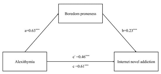 The results showed that a × b was significant (a = 0.63, b = 0.23, a × b = 0.14, p < 0.001); in the analysis procedure that indicated the existence of a mediating path, the boredom proneness of mediating effect was significant. Moreover, after controlling the mediating variable boredom proneness, a significant direct effect of alexithymia on the internet novel addiction was found (c’ = 0.46, p < 0.001). The total effect was also significantly positive (c = 0.61, p < 0.001). Therefore, boredom disposition played a partial mediating role in the effect of alexithymia on the internet novel addiction.