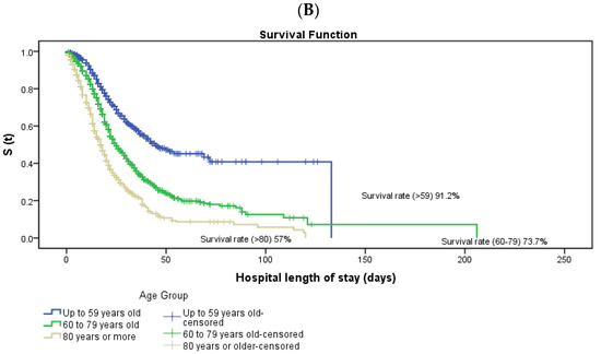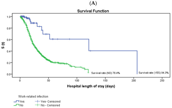 Survival curves of patients hospitalized with COVID-19 in Espírito Santo, Brazil. Log-rank test was used for comparison of equality of survival curves of sociodemographic variables in the period from 1 March 2020 to 31 July 2021. (A) Survival function according to the hospital length of stay of patients hospitalized with COVID-19 in Espírito Santo, Brazil, according to the independent variable work-related infection. (B) Survival function according to the hospital length of stay of patients hospitalized with COVID-19 in Espírito Santo, Brazil, according to the independent variable age group.