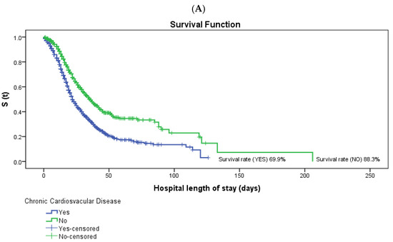 A large number of patients have cardiovascular disease as a comorbidity or develop cardiovascular dysfunction during the pathological process after SARS-CoV-2 infection [24]. The findings of the current study showed that chronic cardiovascular disease, including hypertension, is a factor associated with a higher risk for death and a shorter survival among hospitalized patients, thus corroborating the literature [25]. The impact of COVID-19 on the cardiovascular system is worth noting, as individuals with pre-existing disease are among the most affected by the disease and have a more severe clinical course [24,25,26,27,28,29,30].