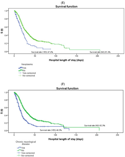 Survival curves of patients hospitalized with COVID-19 in Espírito Santo, Brazil. Log-rank test was used for comparison of equality of survival curves of clinical variables in the period from 1 March 2020 to 31 July 2021. (A) Survival function according to the hospital length of stay of patients hospitalized with COVID-19 in Espírito Santo, Brazil, according to the independent variable chronic cardiovascular disease. (B) Survival function according to the hospital length of stay of patients hospitalized with COVID-19 in Espírito Santo, Brazil, according to the independent variable chronic kidney disease. (C) Survival function according to the hospital length of stay of patients hospitalized with COVID-19 in Espírito Santo, Brazil, according to the independent variable smoking. (D) Survival function according to the hospital length of stay of patients hospitalized with COVID-19 in Espírito Santo, Brazil, according to the independent variable obesity. (E) Survival function according to the hospital length of stay of patients hospitalized with COVID-19 in Espírito Santo, Brazil, according to the independent variable neoplasms. (F) Survival function according to the hospital length of stay of patients hospitalized with COVID-19 in Espírito Santo, Brazil, according to the independent variable chronic neurological disease.