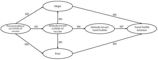 The present study identified the following antecedents that may help explain an individual’s intention to travel to a bubble destination. Individual behaviors often require a favorable attitude [21]. A positive attitude towards vaccination against COVID-19 is likely to also be affected by the belief that COVID-19 vaccines possess the efficacy to protect them against infection or severe symptoms [22]. Perceived vaccine efficacy or sometimes referred to as vaccine confidence was found as one of the main reasons individuals form a positive attitude towards the vaccine [1,22]. Then, a favorable attitude towards vaccination may also lead to a favorable attitude towards the travel bubble program as proof of vaccination is a critical component for partaking in the program. At the same time, the subjective evaluation or emotional responses to the overall pandemic situation can be immensely powerful in promoting engagement in various activities [23,24]. More specifically, due to the uncertain feelings developed by the pandemic’s ever-changing situations emotions such as hope (positive emotion) and fear (negative emotion), the travel bubble initiative could bring excitement to travelers and potentially restart international tourism [25,26,27]. In other words, the availability of vaccines and the travel bubble program may install a certain level of risk-taking (hope) in potential tourists or are they still risk-averse (fear) because of the pandemic [3,4,5].