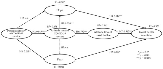 All measurement items have been adopted from previous studies. The items were then rephrased to reflect the context of the study. A total of six latent constructs were measured using a total of 24 items. Whereas the measurement items used to measure the perceived efficacy of the COVID-19 vaccine were adopted from Wang et al. [62]. The attitude towards the COVID-19 vaccine construct was measured using measurement items adopted from Kiatkawsin et al. [38]. The items used to measure hope as well as fear were adopted from Kim et al. [63]. Lastly, attitude towards travel bubbles and travel bubbles intention were measured using items from Lou and Lam [8]. The list of all measurement items can be seen in Appendix A. The items were measured using 7-point Likert-type scales ranging from (1) strongly disagree to (7) strongly agree.