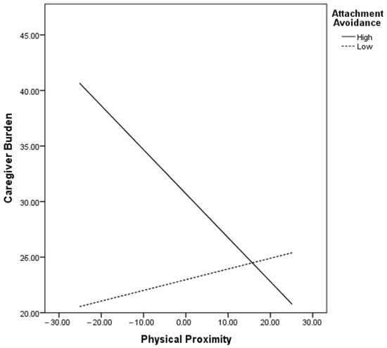 Physical proximity to the care recipient was not associated directly with burden in the correlation analyses. However, the moderation analyses revealed that the relationship between proximity and burden was moderated by attachment avoidance. Specifically, it was found that living closer to the care recipient was associated with increased levels of burden for caregivers with high but not low levels of attachment avoidance. These results support our hypothesis that comfort with interpersonal physical proximity may be related to comfort with interpersonal emotional proximity in caregiving. Consistent with the theory of attachment, caregivers may tolerate physical proximity in accordance with their attachment orientations, with those who are highly avoidant and seek emotional distance being less tolerant to physical closeness and thus more vulnerable to the pressures of caring when living closer to their care recipient [40,41,42]. Our finding is also in line with prior studies of attachment orientations and physical proximity in romantically involved adults, suggesting that more securely attached individuals are more able to seek proximity with their partner, whereas more avoidantly attached individuals may retract from their partner, both emotionally and physically [30,80,81].