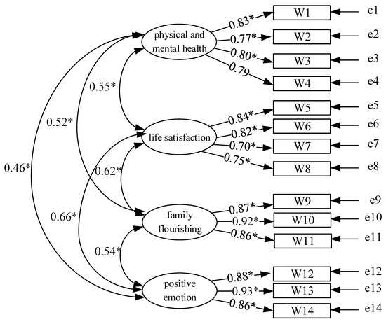 The CFA results indicate that the four latent variables found in stage 1 are physical and mental health, life satisfaction, family flourishing, and positive emotion. Furthermore, in these latent variables, physical and mental health and life satisfaction have 4 observed variables, respectively; both family flourishing and positive emotion have 3 observed variables in them. The analysis model of the recreational sport well-being scale is shown in Figure 1.