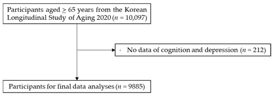 The data used in the present study were obtained from the 2020 Korea Longitudinal Study on Aging (KLoSA), a nationwide population-based survey conducted in Korea in which data were collected using a computer-assisted personal interviewing protocol. In brief, a total of 10,097 older adults (6062 females and 4035 males) ≥ 65 years of age participated in the survey. Individuals without a score on the Korean version of the Geriatric Depression Scale Short-Form (K-GDS-SF) and/or unavailable cognition data (n = 212) were excluded. The remaining 9885 individuals (3955 males and 5930 females) were used for the final data analyses (Figure 1). The Institutional Review Board of the Korea Institute for Health and Social Affairs reviewed and approved the survey (approval no. 2020-36). Informed consent was obtained from all participants. Detailed information regarding the KLoSA is available through the national public database (https://survey.keis.or.kr/eng/myinfo/login.jsp (accessed on 4 March 2022).