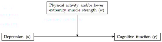 A conceptual diagram of the relationship between depression (x) and cognitive function (y) moderated by physical activity and/or lower-body muscle strength (w).