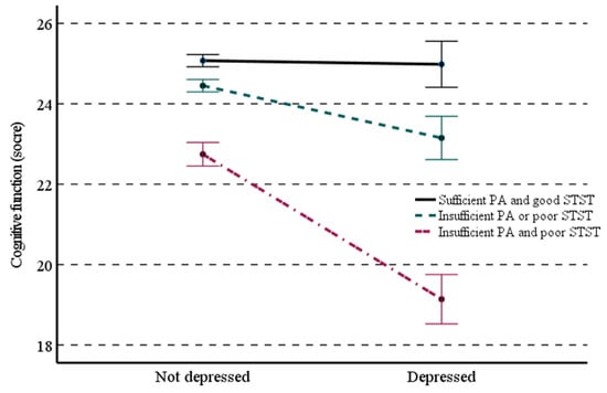 Effect of physical activity (PA) combined with sit-to-stand test (STST) on the relationship between depression and cognitive function in Korean older adults. STST was classified as good if the sit-to-stand test consecutively performed 5 times or poor if the 5-times sit-to-stand test was failed/not attempted. PA was classified as sufficient if meeting the global recommendations on PA (≥150 min per week) or insufficient if not meeting the global recommendations on PA (<150 min per week or no PA).