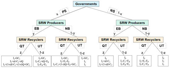Based on the above assumptions, under different behavioural strategy choices, the three-party evolutionary game tree of the government, recyclers, and consumers is shown in Figure 2.