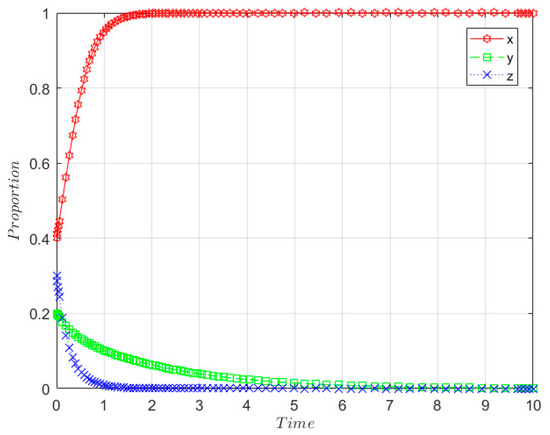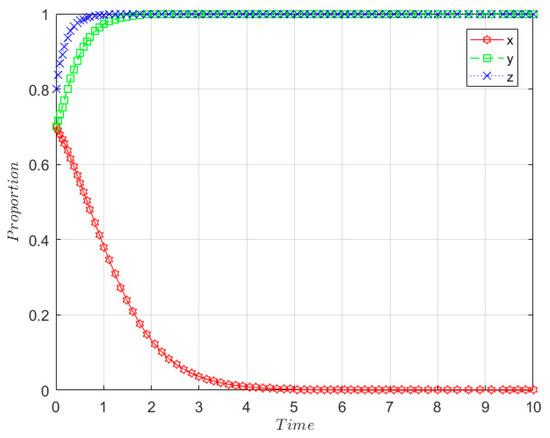 The initial willingness of the government, SRW producer, and SRW recycler are taken to be x = 0.4, y = 0.2, and z = 0.3, respectively, and the relevant parameters are set as follows: m = 0.5; I1 = 8; GC3 = 0.6; GC1 = 0.6; r = 0.5; Q = 2; n = 0.5; I = 4; FP = 1; FR = 1.5; E1 = 2; GC2 = 3; E2 = 1; I3 = 2; C2 = 10, C1 = 3, and the parameters satisfy the stability determination condition of (1, 0, 0), which also means , , , and the evolution results are shown in Figure 3.
