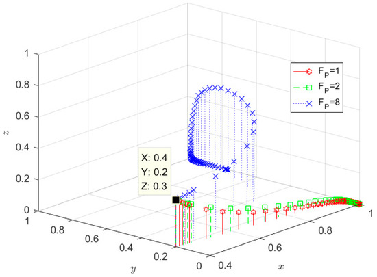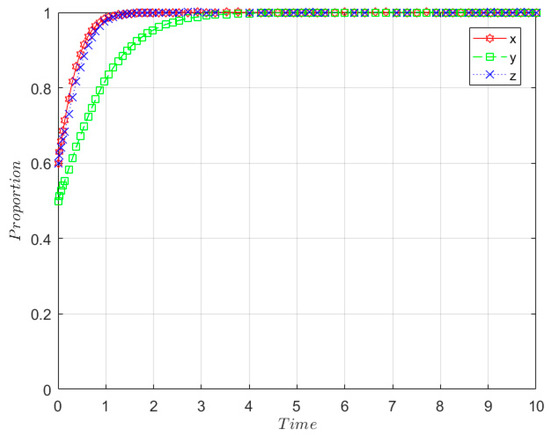 Let , then we can obtain eight pure strategy solutions of the three-dimensional dynamical system, which are (0, 0, 0), (0, 1, 0), (0, 0, 1), (0, 1, 1), (1, 0, 0), (1, 0, 1), (1, 1, 0), (1, 1, 1). These eight equilibrium points constitute the boundaries of the solution of the three-way evolutionary game, which is .