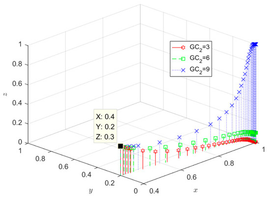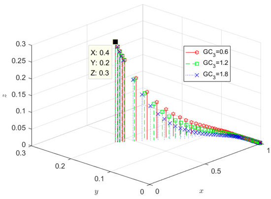 The GC2 parameters are set to 3, 6, and 9, respectively, and the evolution results are shown in Figure 6. From Figure 6, it can be seen that the more considerable the number of government subsidies for government participation in wastewater recycling, the more SRW recyclers tend to adopt qualified treatment strategies without changing the evolution rate and evolution trend of government, SRW producers, which is because with the gradual increase of inequality is destroyed. At the same time, there is no effect on inequality , , so government and SRW producers still evolve and stabilize to (1, 0), consistent with the similar findings of Su et al. [45].